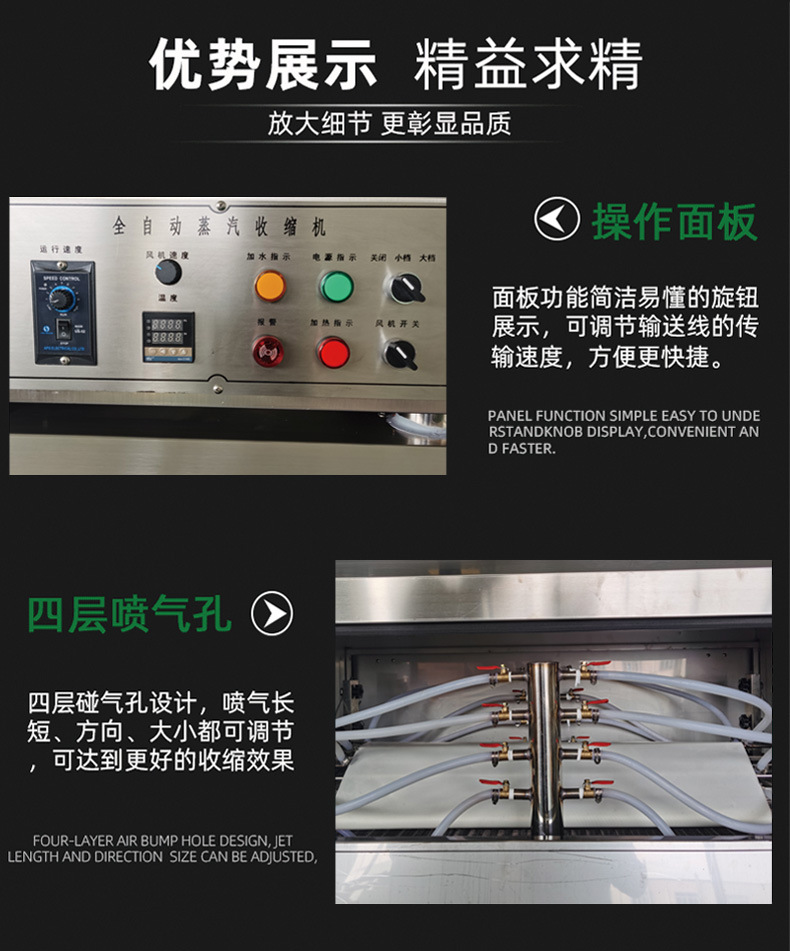 • 參數(shù)易控:配備溫度計(jì)及壓力表,蒸汽壓力及收縮溫度一目了然,開(kāi)機(jī)操作方便 。蒸汽進(jìn)氣閥門(mén)裝有刻度盤(pán),節(jié)省每班操作開(kāi)機(jī)時(shí)間,操作人員可以快速準(zhǔn)確地進(jìn)行參數(shù)設(shè)置和調(diào)整,降低了操作難度和培訓(xùn)成本135.