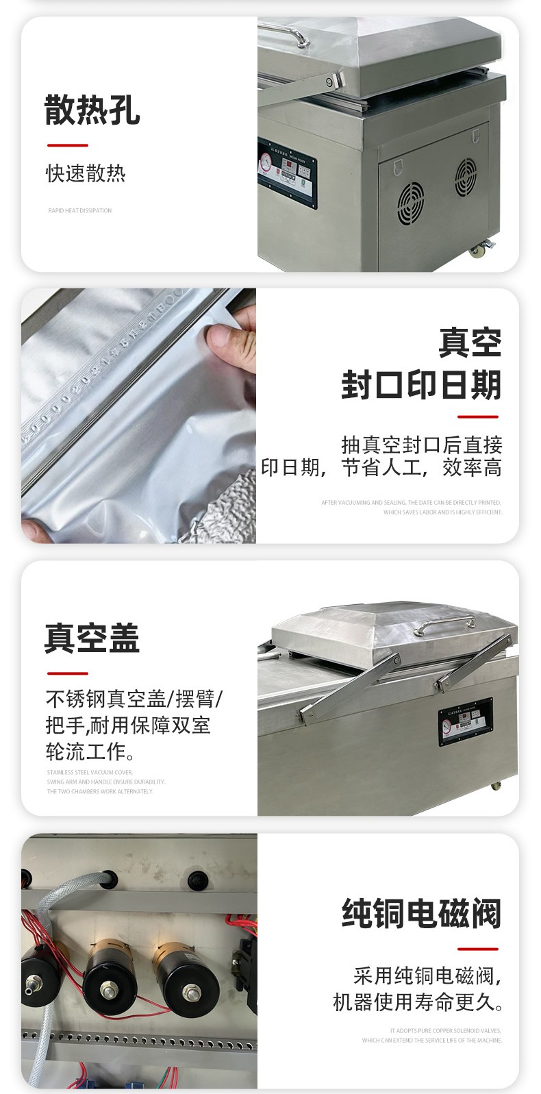 • 人工操作熟練度:操作人員放置產(chǎn)品、撫平袋口、取出成品的速度,直接影響兩個真空室的交替銜接效率。新手操作可能導(dǎo)致 “空等” 時間增加。