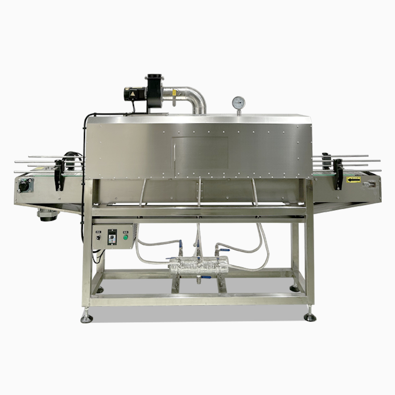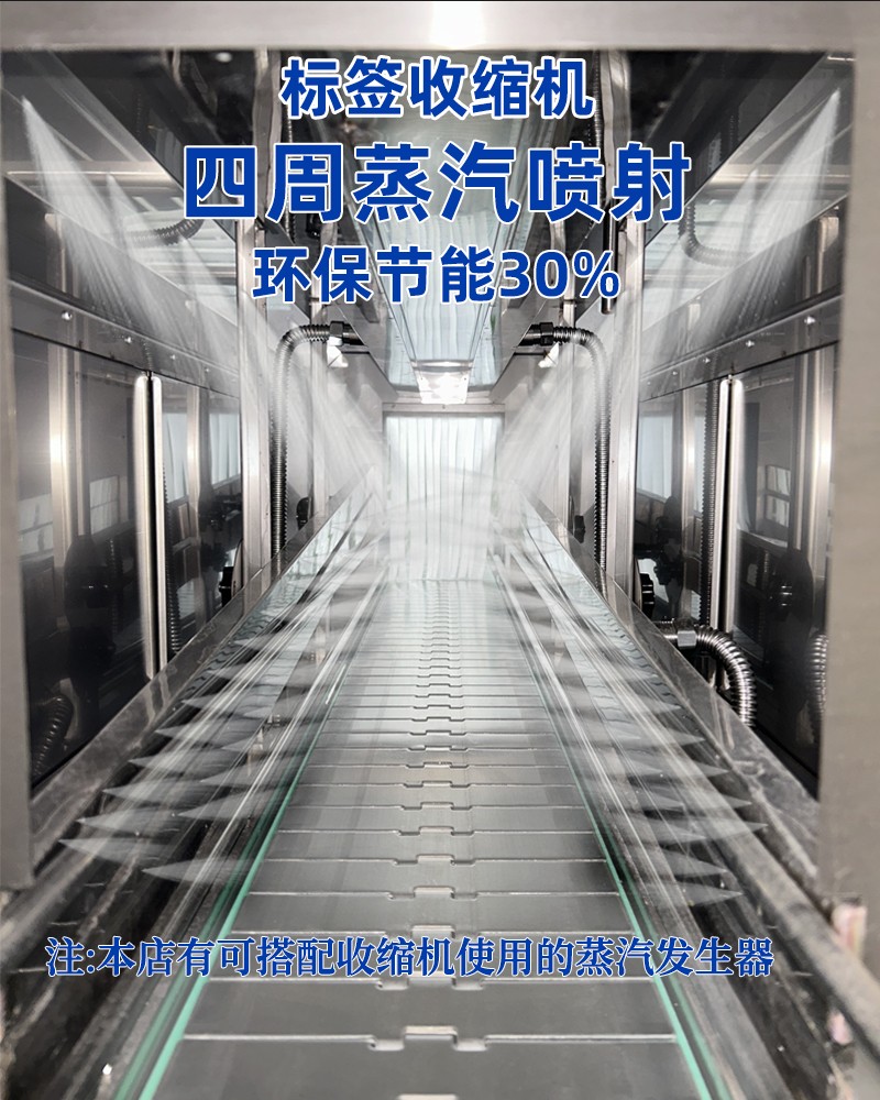 • 帶有封閉薄膜的產(chǎn)品被輸送帶送入蒸汽收縮通道。